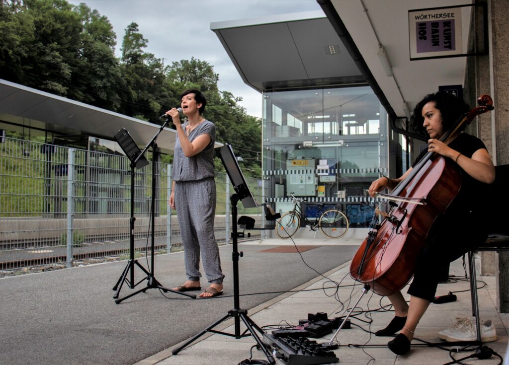 Bild+Video Bildergalerie | Räumlichkeiten 2021 Ausstellung ANITA WIEGELE (rechts im Bild), Kuratorin Barbara Ambrusch-Rapp, Vzbgm Markus Fantur (Foto: Marcel Ambrusch) Ausstellung ZEITENFILTER Nina Herzog 2021 mit Leopold, Niclas Anatol, Nina Herzog, Romana Egartner (Foto: Marcel Ambrusch) Sommeratelier+Ausstellung INA LOITZL 2021: Ass. Lara Stathopoulos, Ina Loitzl, Bgm. Ferdiand Vouk (Foto: H. Sobe) Sängerin Sou Brigitte SOUČEK & Cellistin Ana Laura DOMINGUEZ 2021 (Foto: Lara Stathopoulos) Ausstellung Detlef Löffler 2020 (Foto: Detlef Löffler) Ausstellung Eva Asaad 2020 Ausstellung Marlies Liekfeld-Rapetti 2020 Carinthischer Sommer: CS unterwegs mit Klakradl Ausstellung Renè Fadinger 2019 Lesung Karin Prucha 2019 Ausstellung Ronald Zechner 2019 Ausstellung Martina Unterwelz 2019 Workshop startet gleich 2018 Eröffnung Kunstbahnhof Wörthersee 2018 (Foto: LPD/Steinacher)