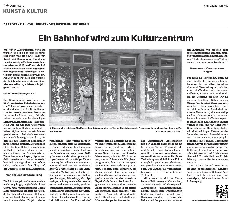 Ein kleiner Einblick in die Entstehung des Kunstbahnhofs Wörthersee ist in der Ausgabe April 2026 in der CONTRASTE „Monatszeitung für Selbstorganisation“ nachzulesen. Wir freuen uns sehr über die schöne Präsenz!