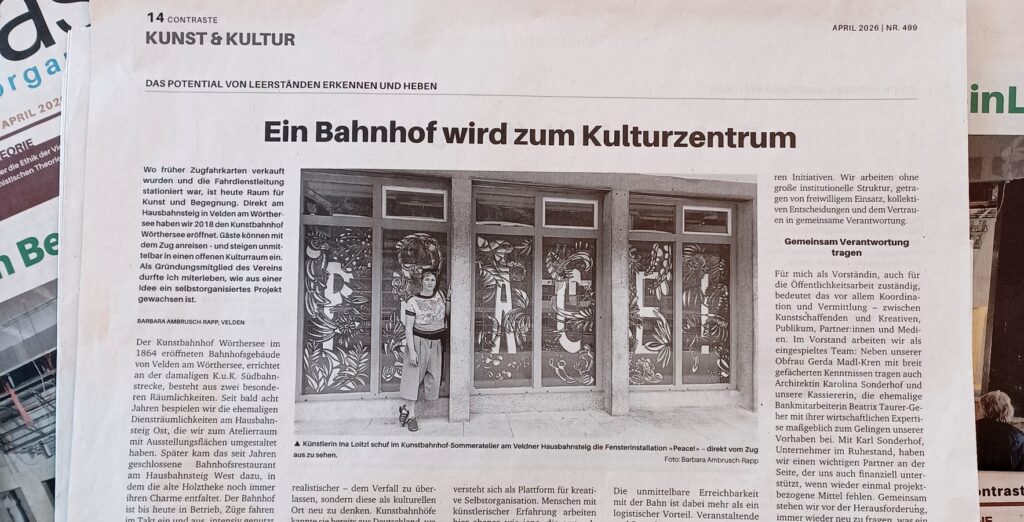 Ein kleiner Einblick in die Entstehung des Kunstbahnhofs Wörthersee ist in der Ausgabe April 2026 in der CONTRASTE „Monatszeitung für Selbstorganisation“ nachzulesen. Wir freuen uns sehr über die schöne Präsenz!