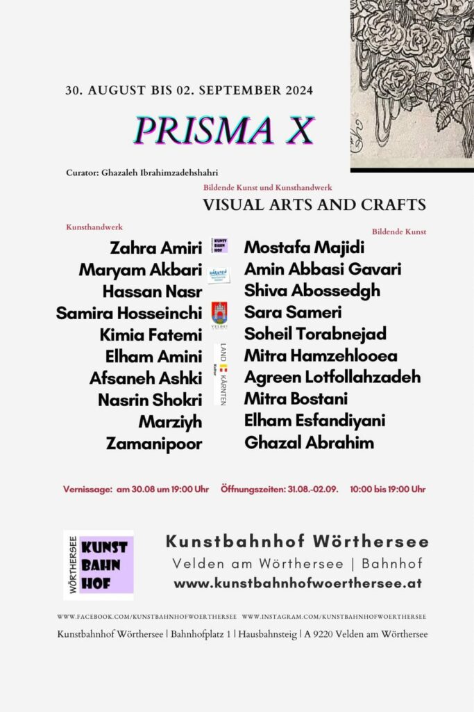 Ausstellung „PRISMA X“ mit Bildender Kunst von Mostafa Majidi, Amin Abbasi Gavari, Shiva Abossedgh, Sara Sameri, Soheil Torabnejad, Mitra Hamzehlooea, Agreen Lotfollahzadeh, Mitra Bostani, Elham Esfandiyani, Ghazal Abrahim und Kunsthandwerk von Maryam Akbari, Zahra Amiri, Hassan Nazar, Kimia Fatemi, Elham Amini, Nasrin Shokri, Afsaneh Ashki, Samira Hosseinchi, Marziyh Zamanipoor …