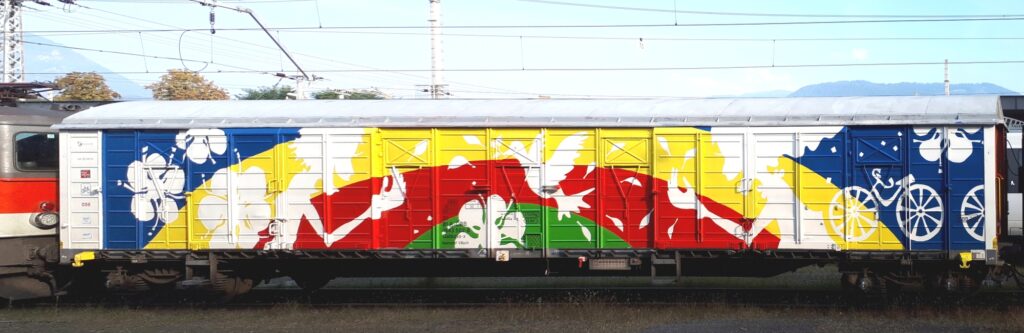 Der von Kindern der VS Lind ob Velden und Kindermalschule gestaltete ÖBB-CARINTHIja2020-Fahrradwagen ist kunterbunte Kulisse. Für ein paar Stunden steht der besondere Waggon am Veldner Hausbahnsteig und fährt am selben Abend weiter zum nächsten umweltfreundlichen Einsatz auf Schienen.