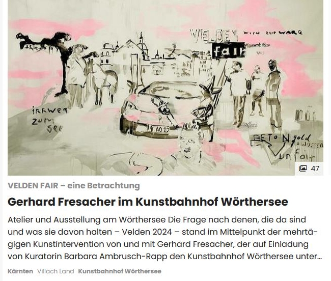 (Abbildung oben: „velden fair“ Jänner 2024 von Gerhard Fresacher, entstanden im Kunstbahnhof Wörthersee nach Recherche und Interviews mit Bürgerinnen und Bürgern in Velden)