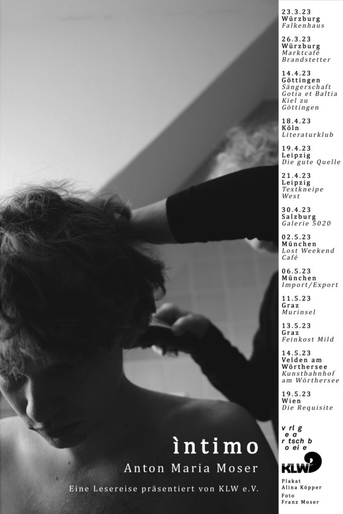 Anton Maria Moser ist Theatermacher, im letzten Jahr debütierte er mit einem satirischen Bürgerstück namens „Ein Mensch stirbt – ein Drama in 14 Szenen“ im Verlag Rotscheibe; für sein aktuelles Bühnenprogramm „ìntimo“ wird er daraus lesen, sowie aus anderen, veröffentlichten und noch unveröffentlichten Stücken. Das Programm dieses Abends dreht sich um die emotional-körperliche Intimität des Menschen im erotischen Miteinander, im Begehren, Trennen und Episodischen. Anregungen durch „episodische Monogamie“ inklusive…